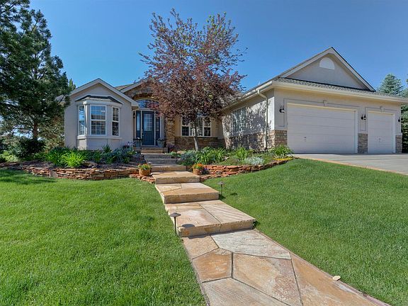 Spectacular 4 bedroom Semi Custom Ranch located in Forest Park, a sought-after Castle Pines subdivision, nestled in trees with views to Pikes Peak. Ashcroft Home Builders impeccable style, Elegance and Craftsmanship, truly evident in every custom detail with an additional 125K in recent upgrades (2011-13). Brand New Kitchen featuring custom Alder cabinets, slab granite, stone back splash, double ovens, gas cooktop and under cabinet lighting. Gleaming hardwood floors, Travertine tile floors, 10/12FT ceilings on the main level, Stacked Stone accented fireplaces, new interior paint colors, new carpeting and hardware throughout. Main floor study with built-ins and tons of light! Large main floor master bedroom opens to the deck, gas fireplace and remodeled dream master bath with oversized European shower for two, large jetted tub and walk-in closet. Entertainers dream walkout Basement designed with 9FT ceilings, large bar with granite counters, stone fireplace and plenty of room to hang with friends. Two guest bedrooms share the newly remodeled European shower. Professionally landscaped to enjoy the views-covered deck and patio for entertaining, flagstone paths, landscape lighting and plants to span all seasons. Oversized fully finished and heated 3 car garage. Easy access to HWY. Fantastic Schools.