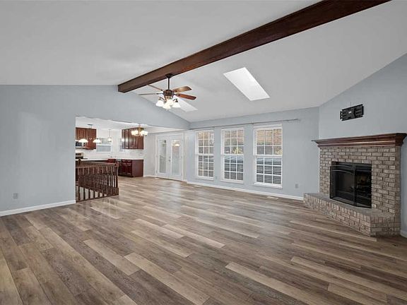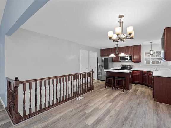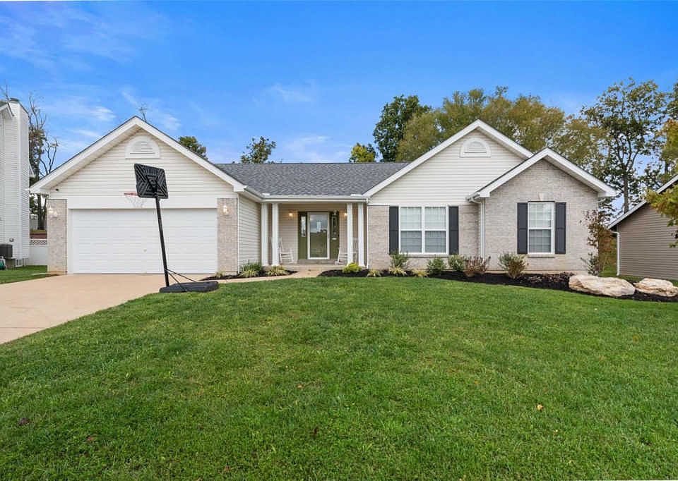 Fabulous ranch on a quiet cul-de-sac backing to Peine Ridge Elementary & Splash Station Aquatic Center. Updated easy-care vinyl plank floors throughout! Soaring vaulted ceilings with skylights & a gas fireplace in the open family room leading to the kitchen with updated appliances, breakfast bar island & an atrium door that exits to the oversized patio in the fully cedar fenced back yard. Spacious owner's suite with a walk-in closet & private bath with dual sinks, jetted tub & separate shower. Handy main floor laundry. Recent bathroom updates. Unfinished lower level with a roughed-in bath. NEW (2020) roof & refreshed landscaping. NEW (2020) Endless Swim Spa w/treadmill & stereo system on a NEW (2020) concrete pad also available for purchase. Close to shopping, dining & amenities & easy access to I-70/61/64. Lovely home in a fantastic location! Don't miss it!