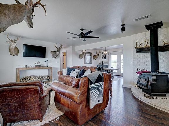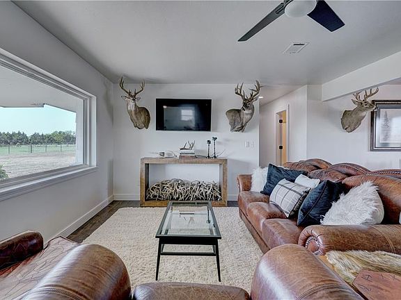 This ranch style home was COMPLETELY renovated in 2022 to offer you the best of modern living! This spacious home features 3 bedrooms, 2 bathrooms, and boasts a large laundry room complete with a mud bench and drop zone. You'll love the large study or bonus area that is perfect for work, play, or even a 4th bedroom, giving you the flexibility to make the most out of your space! Walk out the double doors into the backyard with oversized patio and fire pit area perfect for entertaining guests, cooking out and enjoying the sunset over the rolling plains! With 5 fully fenced acres surrounding you, you can enjoy the peace and privacy you've always dreamed of plus have ample space for vehicles or equipment with a detached 2 car garage and 2 additional large barns on the property. This home is move-in ready and waiting for its new owners, don't miss the chance to make it yours today!