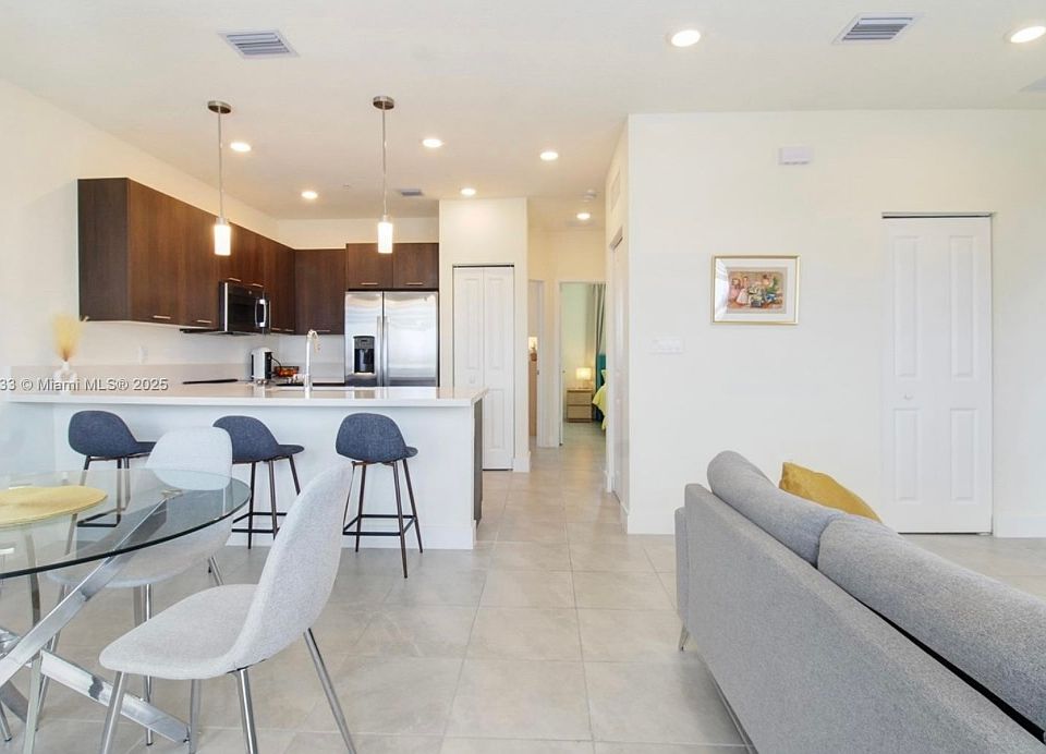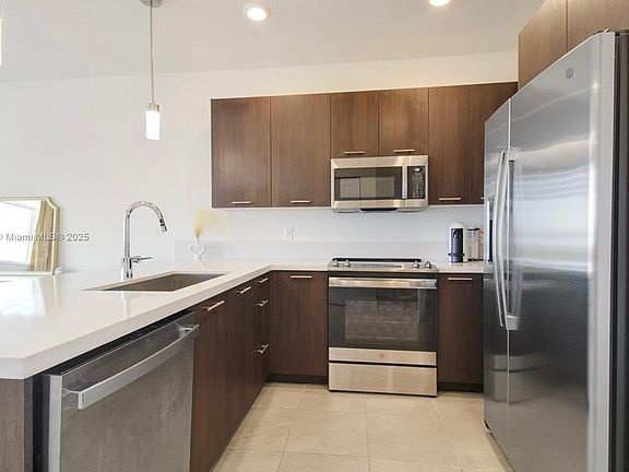 Sleek kitchen with stainless steel appliances, quartz countertops & ample cabinetry