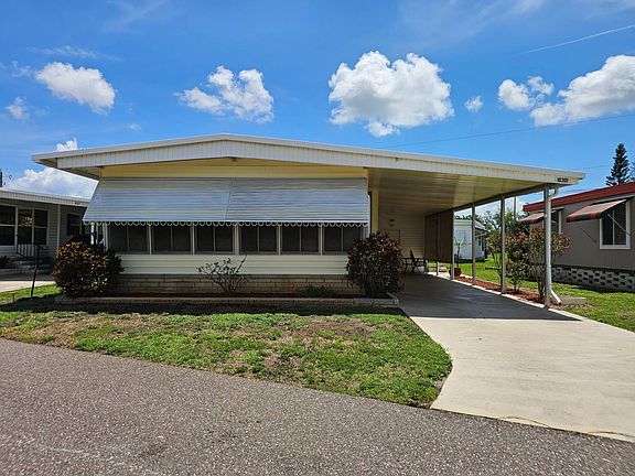 Charming Home on a Scenic Pond with Swans! Welcome to your serene retreat in this beautifully maintained 2-bedroom, 2-bathroom home nestled on a picturesque pond with graceful swans. This home offers tranquil views and a cozy Florida lifestyle. 100% waterproof luxury vinyl flooring throughout, no carpet. BRAND-NEW Mini Split HVAC systems freshly installed in home and screened room! Walk in and be amazing by the sheer size. Beautiful kitchen with ample cabinetry seamlessly leads to the massive open floor plan. The abundance of windows creates a very naturally lighted space. Sliding door opens to the spacious screened room with its own central mini split HVAC system, keeping it comfortable all year long. Boasting gorgeous water views throughout, this home is a dream. Main bathroom features a shower/tub combo, two linen closets and a spacious vanity with storage. Two additional linen/ utility closets located in hall, no shortage of space in this home! Main bedroom will comfortably fit a king size bed and offers both a walk- closet and an impressive en-suite. This bathroom is completely renovated with large tiled walk-in shower with bench seat, lighted medicine cabinet mirror and over the toilet storage. Long covered carport outside offers ample parking space for your cars/guests and is equipped with an oversized storage shed. This shed acts as a multi-purpose area and has full-size laundry, workspace and extra shelving for additional storage needs. Conveniently located right by the community pool/spa. Our 55+ community offers a large heated swimming pool/spa with lake view, , shuffleboard courts, horseshoe pits, fitness center and a clubhouse that hosts a multitude of resident events!