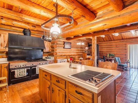 This is a very unique true log home situated on a private road over 10 acres all fenced! There will be easy access when the new turnpike entrance/exit is complete. Exterior has been resealed, newly installed roof with ventilation system, water softner/filtration for entire home in Quonset, 20 person storm shelter. new electricity to hot tub, 2 brooding houses, new ceiling fans, 6 burner commercial stove with separate grill, double ovens, wood flooring, set up for central vac but not installed, lots of windows for natural lighting, Barn 30x50, Greenhouse with heater, larger bedrooms, potting shed, well and septic, has front and back deck,CREC-electric, Propane-gas! Property being sold "as is-where is"