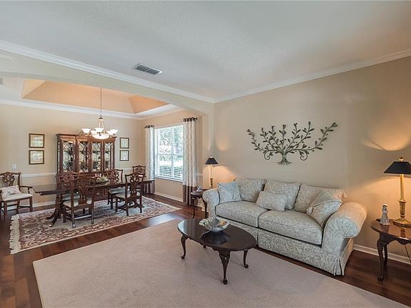 - Interior Features: Ceiling Fans(s), High Ceiling(s), Living Room/Dining Room Combo, Master Bedroom Downstairs, Split Bedroom, Crown Molding, Walk-In Closet(s), Open Floorplan, Solid Surface Counters, Kitchen/Family Room Combo, Built in Features, Tray Ceiling(s), Thermostat
