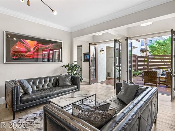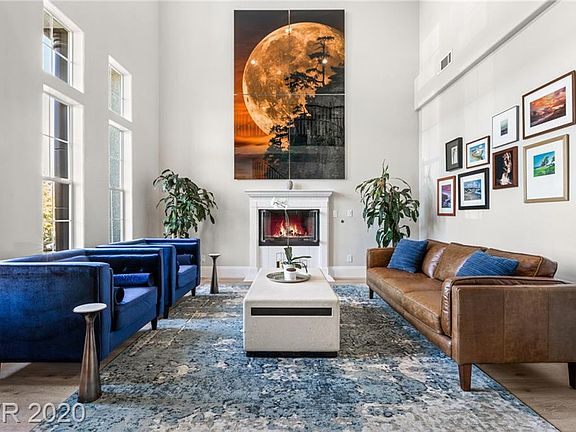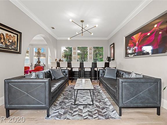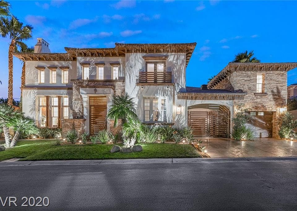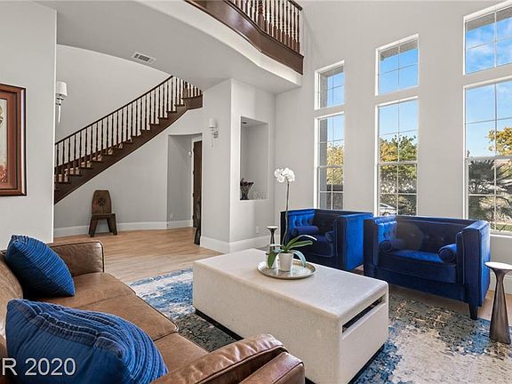 Situated on a premier Palisades lot backing up to TPC Vegas, this impressive Summerlin residence has been extensively remodeled to provide the ultimate living experience. With over 6,000 square feet, this exceptional home groups all bedrooms on the second level for the ultimate in privacy and family togetherness. The main floor contains expansive formal and informal spaces to showcase a personal art collection and cater to the needs and preferences of a busy, active family, abundant space for entertaining. The kitchen is a vision in pale tones, with wood flooring, stainless steel appliances, granite slab countertops, white-painted cabinets and a huge central island. It is truly the heart of the home, and serves the adjacent dining area and family room with ease. It is also provides easy access to the rear yard and outdoor patios. This home boasts a luxurious master suite with dual sets of French doors and Juliet balconies to capture cooling breezes.
