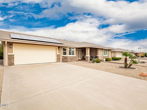 WOW! This WEMAR Blue Ribbon Winner was thoughtfully renovated for 55+ active adults. Featuring 3 spacious bedrooms and 2 baths, along with a 2-car garage, this residence is a true gem. Experience modern enhancements like a 2017 4-ton HVAC, new stucco with stone veneer, and a fully paid-off solar system. Inside, discover a revitalized space boasting a wood support beam, new doors, and flawless popcorn-free drywall! The chef's kitchen dazzles with mocha-stained cabinetry, granite countertops, and stainless steel appliances. Tile, plush carpet, 5'' baseboards, and ceiling fans throughout. Bathrooms showcase tiled showers, a large tub, elevated cabinets, mirrors, and toilets. Enjoy indoor laundry, added insulation, and a wired security system for ultimate convenience and peace of mind. Step outside to inviting front and back patios, bathed in North/South exposure. Low taxes add to the allure, with strategic proximity to recreation centers, restaurants, and shopping. Engage in active adult living with access to two of seven recreation centers, eight golf courses, bowling, a dog park, and a 33-acre lake. Your dream lifestyle awaits!