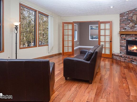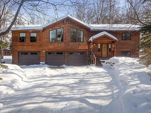 Well situated for privacy, this 2711 sq/ft home sits on over a half acre lot with no HOAs, fees or dues. The three car garage has room for your vehicles and toys with a large drive way and parking area for an RV. It is perfectly located off Eagle River Road for an easy commute. It is also close to schools and downtown Eagle River. Inside features 4 bedrooms and 2.75 bathrooms. The office/den could be a 5th bedroom. Main living area has brazilian cherry hardwood floors and solid cherry 6 panel doors. Bedrooms have new carpet. An updated kitchen with solid surface counters, stainless steel appliances, gas stove, a deep farm sink, solid cherry custom cabinets, and travertine tile. Kitchen also looks out into the expansive dinning room with large glass atrium to enjoy the morning sun. Enjoy viewing the trees from the living room, or watch for moose out on the large back deck. large back yard includes a 12x16 shed, a paved patio for grilling, and a additional paved patio with lighting and is wired for a hot tub. The family room can easily accommodate everyone for movie or game night. This home is move in ready!