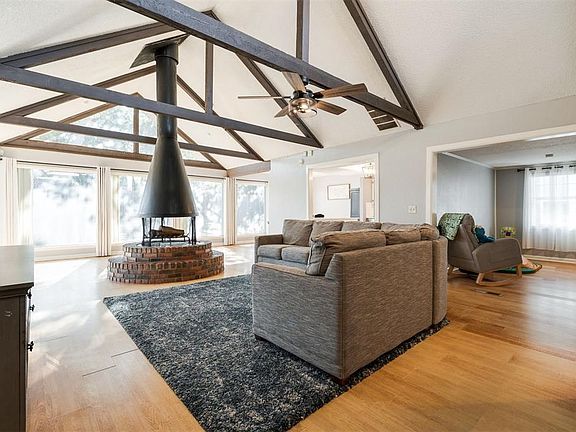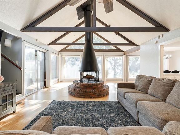 Upon entering, you will be greeted with a gorgeous cathedral ceiling, and the beautiful free standing fireplace. The large picture windows surround the entire open main areas, providing so much natural light. Off the living room is a flex space which can be used for an office, play room, game room etc., the possibilities are endless. Downstairs is the primary suite, and 3 additional bedrooms. Upstairs you will find 2 more bedrooms.