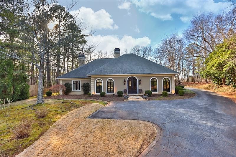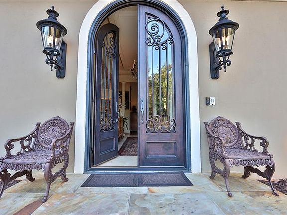 Gorgeous One Level Living on Beautiful 1 plus acre lot. 4 car garage, 3 fireplaces, Incredible Gourmet Kitchen with top of the line Stainless Appliances. Majestic 12 & 14 Foot Ceilings. Two Elegant Master Suites with Fireplaces and Spa Like Baths. Enjoy Relaxing or Entertaining with the Private Backyard Resort style Oasis, featuring Sauna, Gorgeous Pool and Covered Open Air Cabana with private wooded view beyond. Outbuilding is perfect for Workshop or 5th Garage. Hardcoat Stucco with beautiful double arched bronze doors. No HOA.