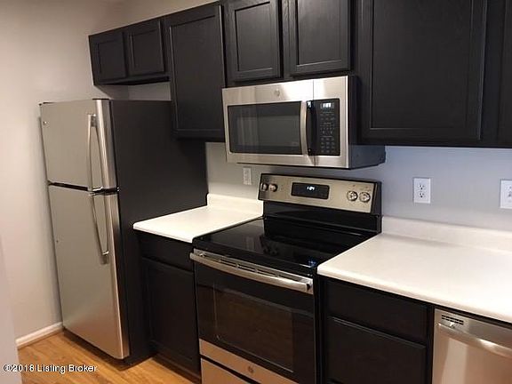 Gorgeous remodel! Desirable 1st floor unit w/zero steps -in back of unit away from front door traffic. Design configuration of this condo feels very spacious with great open floor plan for entertaining. Move-in ready. Large bedrooms - two with walk-in closets and Master has two walk-ins of its own! Brand new stainless appliances, new granite island countertop; newer flooring and carpet throughout; newer light fixtures and 4 ceiling fans; water heater two years old. Master has TWO separate walk-in closets and ensuite bathroom. Patio facing green space. Detached garage + assigned parking space and extra storage in interior hallway near unit. Digital door lock Close to I-71 and I-265, Costco, Norton Commons, The Paddock Shoppes, entertainment - all the conveniences!