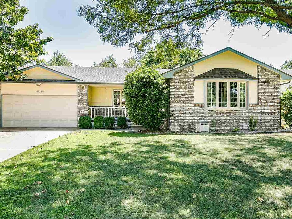 Welcome home to this spacious 4bed/3bath/over-sized 2-car home in the popular Goddard school district. This home features newer wood laminate floors throughout the common living areas, brand new carpet in the bedrooms and basement, new tile flooring in both main floor baths, and fresh interior paint throughout. The kitchen boasts granite counter tops, new glass tile back splash, new fridge (remaining with the sale), 2-year-old dishwasher, and updated lighting. The open master bedroom features a coffered ceiling, double closets, and en suite bath with granite counter tops, new cabinetry hardware, tub/shower combo, and skylight. Downstairs is a large fourth bedroom, a wood burning fireplace, newly finished full bath, and loads of storage space. Exterior amenities include new siding, fresh paint, and rear patio. The sizable yard is fully fenced, and has beautiful, mature trees with no rear neighbors. Close to highways, shopping, restaurants, and Pawnee Prairie nature trails, this home is in a quiet neighborhood with no special taxes. Call us today for a showing before it's gone!