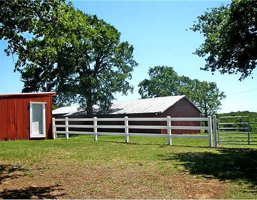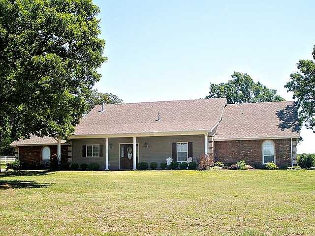 Beautiful 2500 Sq Ft custom built brick home sitting on a groomed 24 acre corner only 2miles from town. Open floor plan offers large kitchen, lots of cabinet storage, pantry, center island/breakfast bar and large built in china hutch. Family room features a 10 foot ceiling and corner gas fireplace, French doors open onto covered patio that over looks property. Master suite has large jacuzzi tub, walk in shower, walk in closet with built in dresser and linen cabinet. 2 other bedrooms share a Jack & Jill bath with 1 bedroom having a double Murphy pull down bed in a lovely wooden cabinet. Property includes large shop, 2 barns all with electric and water, 2 ponds and storn