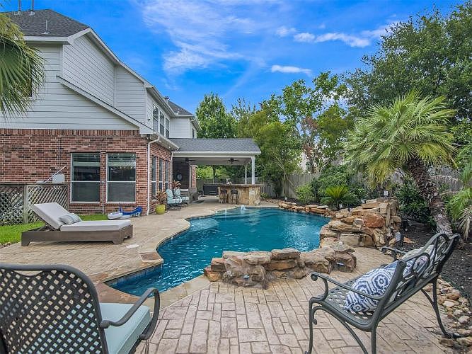 Stunning home located in the highly sought-after Gleannloch Farms subdivision. This 5 bedroom home is move-in ready and offers a grand 2 story entry, updated tile floor in the study, warm wood flooring, and updated light fixtures. Recently added custom cabinets with LED lighting by the fireplace. Adding to the extra fun of this home are the smart lights located on the front porch, back patio, and breakfast room. You can control the mood with your phone via an app. Why leave to go on an expensive vacation when you have your own paradise in your backyard! Stunning covered outdoor sitting area with full outdoor kitchen. Plenty of yard space for extra toys and running space. The roof is 5 years old, the HVAC system was replaced in 2018, the water heater in 2019, and new Nest thermostats on both floors. The pool pump is variable speed new in 2021 and the pool light is LED multicolor also new in 2021. Make sure you see this one before it is GONE!