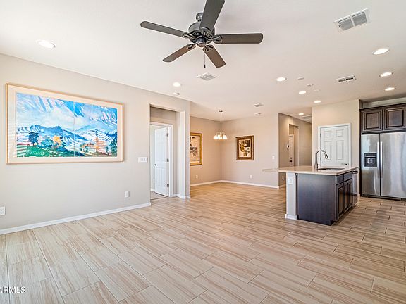 Lowest $$ Home in Encore!! Charming 2 bedroom 2 bath single level home in Eastmark's Encore 55+ Master Planned Community with award winning clubhouse-The Encore Club. Large open Kitchen with Quartz Countertops & Designer Backsplash under counter lights, Large Island, SS Gas Stove & appliances. Kitchen features 42'' Expresso Cabinets with roll out drawers, recycle bins, & Pantry. Large 12 x 24 Tiles in all main areas and neutral carpet in both bedrooms. Large 4'' shutters adorn the windows throughout. Large Back Patio with newly installed artificial turf in the South Facing Backyard. Beautiful to enjoy & low maintenance. Distant Mountain Views with Common Area behind home. This rare model is ready for its New Owner to start enjoying what Encore has to offer! Don't Wa