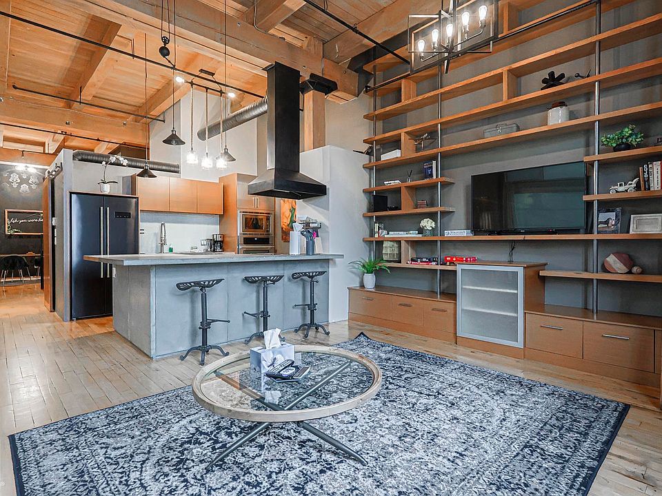 MODERN URBAN LOFT STYLE ARCHITECTURE. If your are looking for unique space in the heart of Downtown, this loft is a must see. Over 1,776 sq ft on two levels of fully developed contemporary living space featuring exposed brick, concrete, 13 foot ceilings, hardwood floors, in-suite laundry, and more. Total of two bedrooms, two bathrooms. Stylish kitchen with concrete countertops and modern cabinets. Underground heated and secured parking. Walking distance to hockey arena, restaurants, farmers market, and Ice District with future LRT station conveniently located next to the building.