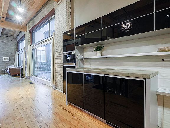 Exposed brickHardwood floorsIn-suite laundryStylish kitchenModern cabinets