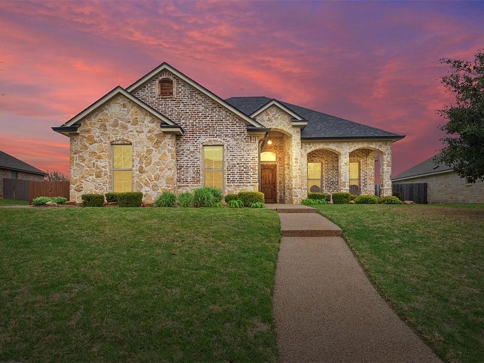 You'll be ready to move right in to 10309 Calaveras Dr. Ideally located in Lakeland Meadows in the China Spring ISD school district. Just minutes to the Waco Regional Airport and Lake Waco Golf Club. Waco hot spots such as downtown, Cameron Park and Baylor University are just a short drive away. Built in 2012, this one owner home has it all. Drive up to the beautiful stone and brick exterior, side entry two car garage, extra sidewalks and cozy front porch. Right off you'll notice the striking newer black roof and gutters (both installed in 2023). Step inside to an entry space and the open living/kitchen/dining space. A true great room featuring low maintenance scored and stained concrete floors, crown molding, wide baseboards and raised ceilings. The living area features a stone corner fireplace and walls of windows with access to an oversized covered patio. Entertain in the open kitchen with large island showcasing a stone facade on living room side, granite counters, stainless appliances, pantry and warm wood cabinetry. Work from home in the separate office space off with built ins and wood French door for privacy. There's plenty of hanging space and granite counter for folding in the laundry room. Isolated primary suite overlooks the beautiful backyard. Relax in the en suite bath with walk in tiled shower, separate whirlpool tub, dual sinks, granite counters and walk in closet. The 2 additional bedrooms are perfectly situated between the guest bath with granite counters and tile bath surround. Backyard trees and landscaping has been placed just right to give plenty of space for a pool, playset or to just play ball! Additional features include sprinkler system, whole house water softening system and recent AC compressor replacement (February 2024).