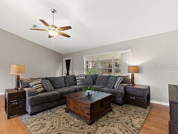 No front or rear neighbors!!!!!!!! Very well taken care of home. 3/2/2 built in 2006 with a Front porch to sit out and enjoy the privacy of no front neighbors. Open concept with Large Eat In Kitchen w/bay window. Plenty of Counter Space, Stainless Appliances. All rooms have wood laminate flooring except baths & indoor laundry room have tile. Great Room plan with cathedral ceiling. Master with Walk in Closet, dual sinks, garden tub for soaking. Split plan bedrooms!!! Lovely screened in lanai looks out to large fenced yard with no rear neighbors. Centrally located and close to shopping, hospitals & restaurants. Newer interior paint as well, shed 2014.
