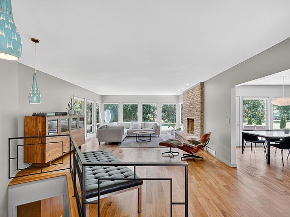 Step inside and be greeted by expansive windows that drench the home in natural light, showcasing the newly refinished walnut hardwood floors and timeless mid-century character. The spacious living room, with a cozy wood-burning fireplace, creates the perfect spot for gathering and relaxing.