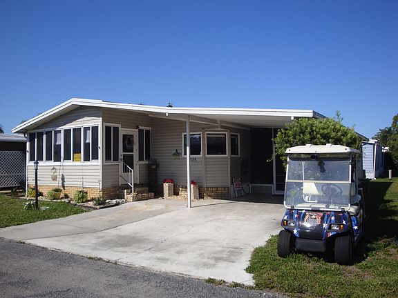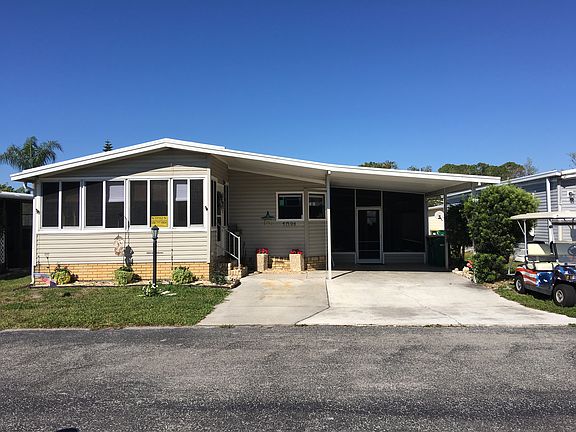 RELOCATING MUST SELL PRICE REDUCED AFFORDABLE WINTER RETREAT OR PERMANENT HOME IN PARADISE! **This home is located in a 55+ Gated Community.** MAKE THIS RENOVATED HOME YOUR TROPICAL RETREAT! THIS LOVELY HOME HAS IT ALL AND IS TURN KEY! SPACIOUS APPROXIMATELY 1500 SQ. FT. CUSTOM TILED THROUGHOUT(no carpeting}, TWO BEDROOMS, TWO FULL BATHROOMS, AC COOLED LAUNDRY ROOM, AC COOLED OFFICE/WORKSHOP,AC COOLED SUN ROOM. LARGE OPEN MODERN KITCHEN WITH CUSTOM TILE BACK SPLASH, GRANITE COUNTER TOPS, NEWER APPLIANCES, CUSTOM WINDOW TREATMENTS. NEW TOILETS, VANITIES AND FAUCETS, EXTRA STORAGE SHELVING INSTALLED IN LAUNDRY ROOM AND WORKSHOP (trust me you will need it) TILED RELAXING SUN ROOM-LANAI WITH A/C. THIS IS A TURN KEY OFFERING AND INCLUDES ALL FURNITURE AND DECOR (INCLUDES big screen HD TELEVISION) (prepped for voice controlled TV and high speed internet} HOME RENOVATION IS COMPLETE AND PRICED TO SELL AT $49,900. INCLUDES BACKYARD DECK FOR GRILLING (INCLUDES GRILL, NEW PATIO SET AND A SELF WATERING MULTI FRUIT CITRUS TREE) (LEMONS, LIMES, AND RUBY RED GRAPEFRUIT) LARGE SCREENED IN PATIO AND A DOUBLE DRIVEWAY FOR EXTRA PARKING THIS HOME HAS A TROPICAL AND MODERN MOTIF THROUGHOUT. A GREAT VALUE IN THIS RESORT STYLE GATED COMMUNITY WITH AN ABUNDANCE OF RESORT STYLE AMENITIES. A Patriotic Golf Cart with charger is available add $1500 to get around in this large park Can be shown days or Evenings! CALL OR TEXT JIM 315-766-7467 FOR YOUR PRIVATE SHOWING