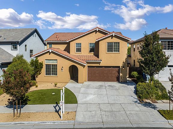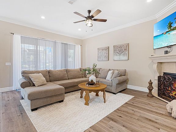 Welcome to this stunning 2-story semi-custom Mediterranean-style home, only 4 years young! from the front door with iron accents to the beautifully detailed stone fireplace mantel, this home boasts old-world charm with modern elegance. The downstairs area features crown molding and high vaulted ceilings, hardwood floors, with carpeted bedrooms for added comfort. this spacious home offers 4 bedrooms plus a loft, 3 full bedrooms up stairs & half-bath in the garage,The kitchen is an entertainer's dream, with granite countertops, stainless steel appliances a custom backsplash, soft-close cabinets, a large kitchen island, & a walk-in pantry, recessed cam lighting and pendant lights .the iron-accented staircase leads to a loft with crown molding and a floating white entertainment center complete with built-in drawers, upstairs laundry room & a hallway cabinets with glass doors for extra storage.The primary suite is your private retreat with its own enclosed balcony, Spanish tile flooring, & an iron-detailed railing. The primary bathroom includes his-and-hers vanities, a sunken tub, a separate shower with seating, & a walk-in closet. while a guest bedroom down stairs w/a full bathroom featuring a marble stone shower & quartz countertop. 3 car tandem garage with Tesla charging outlet .