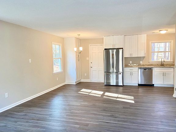 Enjoy one level living in this completely renovated home! It features a open floorplan, brand new kitchen and baths with luxury vinyl plank flooring throughout. New landscaping, paint (exterior and interior), new HVAC system. Comes with all brand new stainless steel appliances and a full size stackable washer and dryer with automatic lighting. Plenty of parking with long driveway. Private and wooded backyard. Pets are negotiable. 12+ months, pets negotiable with breed restrictions