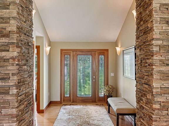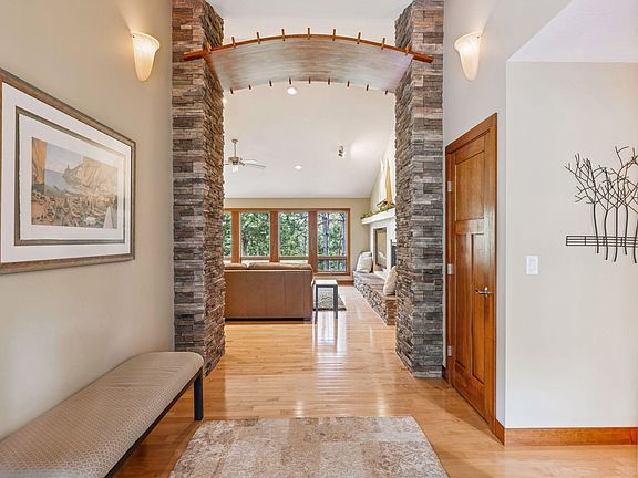 Tucked away on 3.5 wooded acres, this exquisite home offers a rare combination of refined elegance, ultimate privacy, and masterful craftsmanship. With over 2,400 square feet of beautifully finished space on the main level, every inch of this residence reflects thoughtful design and luxurious detail. Upon entering, guests are welcomed through a sophisticated stone archway in the foyer, setting a tone of timeless style and architectural character. Rich maple hardwood floors and custom cherry cabinetry and millwork flow throughout, creating a warm and elevated aesthetic.