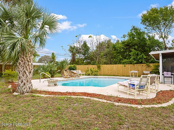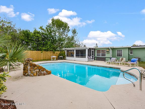 This is the Florida Dream!! Walking distance to the river or 20 minutes to the beach. Watch the rocket launches directly across the river. This remodeled home offers 1900+ sq ft of living space, 4 bedrooms and 2 full baths. An updated kitchen with new appliances with convection oven, counters, cabinets & backsplash. A/C 2024, New luxury vinyl flooring, Upgraded panels. New light switches and LED lighting. Privacy fence 2024, double pane windows. The hall bath has a jacuzzi tub for relaxing. A large family room with a bar with refrigerator & storage off the pool area. Large pool deck with inground pool and waterfall. An ample 4 car driveway parking for your cars/toys. This home is centrally located and close to schools, shopping, medical & restaurants. Great place to make this your home or vacation spot. Make this a priority to see!