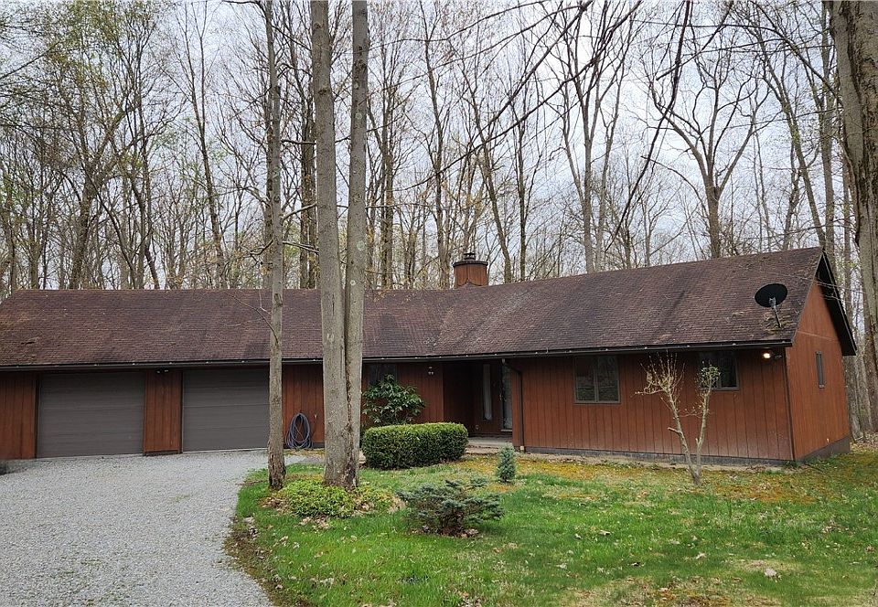 Unique open concept home featuring round main living area with center-spaced floor to ceiling 360 dry stacked fireplace. The right wing of this home is 2-3 bedrooms with large cedar lined closets. The left wing is the oversized 2-car garage with walk up attic for additional storage. Situated on a park-like lot in Jackson Woods area of Ohiopyle, Wharton Twp, this home is one-of-a-kind and is waiting for your touch. If you're looking for somehing out of the ordinary 1031 Nemacolin Drive is a must-see!