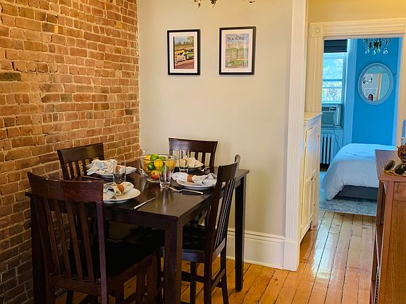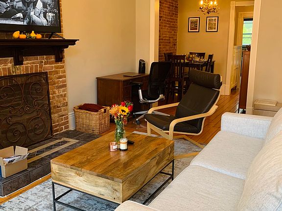 830 sq ft. Tons of old world charm, two separate bedrooms, 1 large, 1 small fireplace, original Pinewood flooring, plantation shutters, ss appliances, mantel, armoire, kitchen island, pot rack in charming historic building. Free laundry and storage in basement. Heat, HW included.