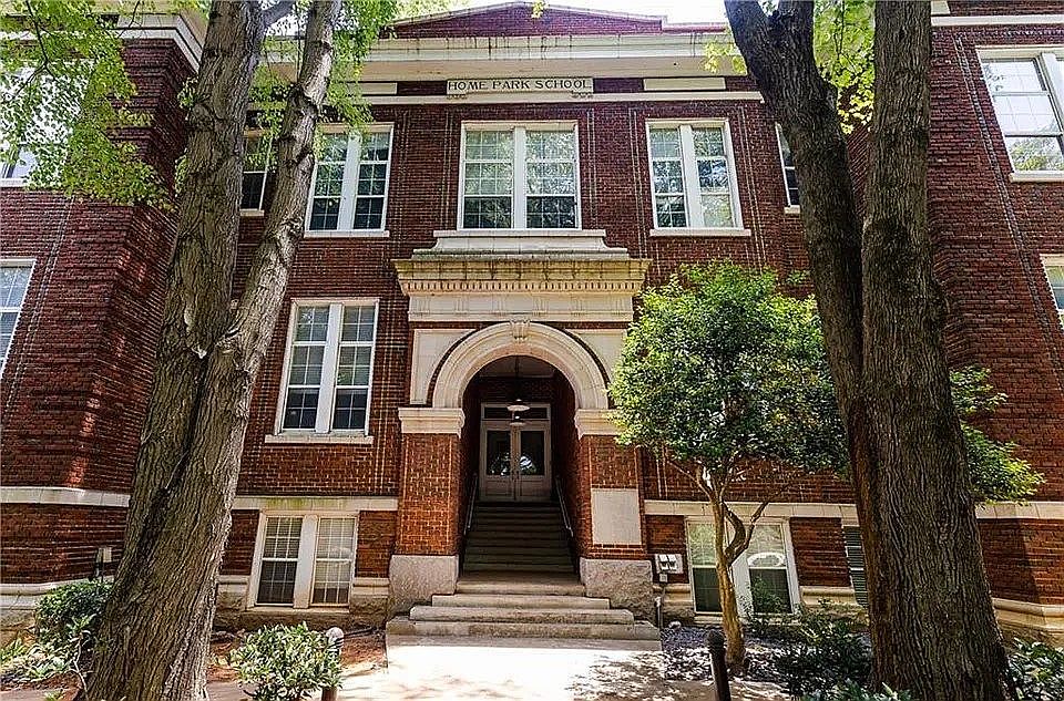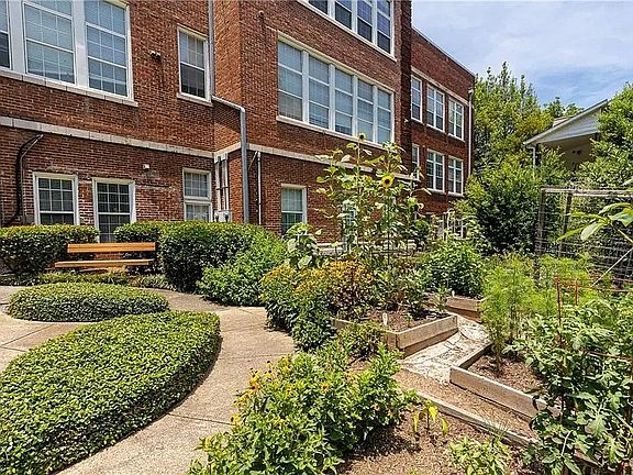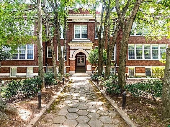 Home Park development, classic brick building built as a school in 1911 and converted to condos in 2004. 2 bedrooms, 2 baths all updated with beautiful pine floors and soaring ceilings of approximately 14 feet. Very secure, quiet, and beautifully maintained. Walk in closet, linen closet, pantry. Saltwater swimming pool, secure indoor bike storage, community garden, and TWO deeded off street parking spaces. New AC, new water heater. New bath/shower valves and fixtures. Full size washer/dryer in unit. Hardwood floors. Walk to GA Tech, Atlantic Station, Tech Square, MARTA. Great secure location in the building.