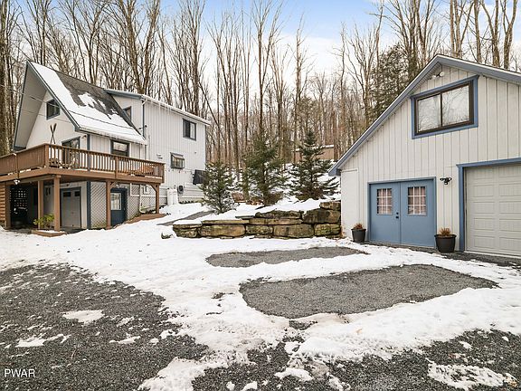 ***RARE OPPORTUNITY in WLE - METICULOUS TURN KEY CHALET ON LARGE COMBINED DOUBLE LOT SURROUNDED BY VIEWS OF WOODS & NATURE*** Welcome to your dream LAKE HOME. Sitting proudly on a generously LARGE PARCEL, this picturesque home is a rare find that offers unparalleled privacy & serenity. The rolling hills of this professionally hardscaped property backs up to community land & is surrounded by multiple open lots -- a little slice of heaven. COMPLETELY UPDATED this 4 BR 2 BA home boasts a masterclass in modern charm, where traditional meets today's latest designs in perfect harmony. Shiplap adds texture & warmth to all NEWLY painted rooms, NEW flooring, updated w/ modern fixtures, stylish features & impactful design choices -- a ''Zen'' oasis of sophistication! The heart of the home, the kitchen, has undergone a complete transformation from top to bottom with state-of-the-art appliances, elegant marble countertop w/ a huge eat-in peninsula; a perfect place for entertaining! The bright & airy feel continues to the high ceiling family room with windows & open light to large deck that looks over the wrap-around driveway and large boulders. The main level is completed with one bedroom & renovated full bathroom. The 2ND floor flows into the bright primary bedroom w/ 2 deep closets & en-suite full bath plus an additional bedroom. The lower level has a den or gaming area, laundry room & bedroom blending comfort, style & attention to detail. This chalet home boasts 5 split units for year round comfort and efficiency. Considering a whole house generator? The hook up is already installed for your convenience. The BONUS of this property is the heated detached 2 car GARAGE LIVING SPACE CONVERSION, a focal point for entertaining, celebrations & karaoke nights. Store up to 3 golf carts in solar heated garage attic, plus a shed for lake toys! Just a short walk to the Beaver Lake beach, this WLE dream home has it all - a 4 season Lake Wallenpaupack Community. Prepare to fall in LOVE!