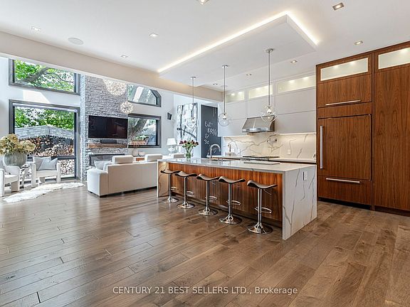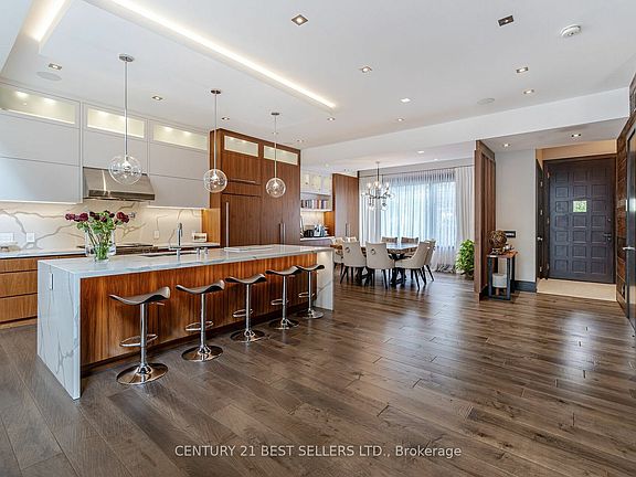 Spectacular very unique house settled on quite street. Elegance and Quality Craftsmanship meet Family Functionality. Outstanding Layout Ideal for Large families. Offering over 5000 sqft living space. Thousand spent on stunning renovation. House provides enormous number of upgrades. Hand scrape maple hardwood floors throughout the house, walls feature handcrafted barn style wood panels, brick venire and wallpapers, custom maple doors 8 feet high in all rooms, Kitchen Has A Large Centre Island with bookmarked calacatta marble counter tops, High End WOLF build-in appliances, Subzero De, Fridge and Full size Subzero wine cooler. Professional Surround Sound system with 6 separate zones throughout the house. Finish Basement with Custom Barn Doors, Home Theatre, Recreation Room & Gym, Wine Cellar, Superior Landscape and Lighting, Fully Fenced Private Backyard, A Relaxing and Enjoying The Outdoor with Bar Section, TV and Hot-Tub, outdoor fireplace