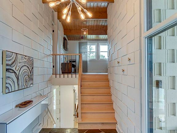 This Mid-Century Modern gem with signature low-slung roof, deep eaves, & striking concrete details radiates retro charm from the curb & continues to impress inside. The entryway featuring original slate floors & a wood-paneled ceiling introduces first of several unique concrete block designs throughout. The office with soaring ceiling includes hidden storage space. Three spacious bedrooms upstairs offer walk-in closets, unique central loft space, paneled ceilings, & maple hardwood floors. The primary suite stands out with distinctive concrete accents, sloped ceiling with large timber beams, & a walk-in closet with laundry. Full bathroom with tiled shower & floating vanity. The lower level showcases a transformed kitchen with two-tone cabinets, quartz countertops, & G.E. Monogram appliances. The expansive dining room, with its fireplace and built-ins, connects to a large yard. Additional updates include a newer roof, HVAC (2022), & vinyl replacement windows. This is a special home.