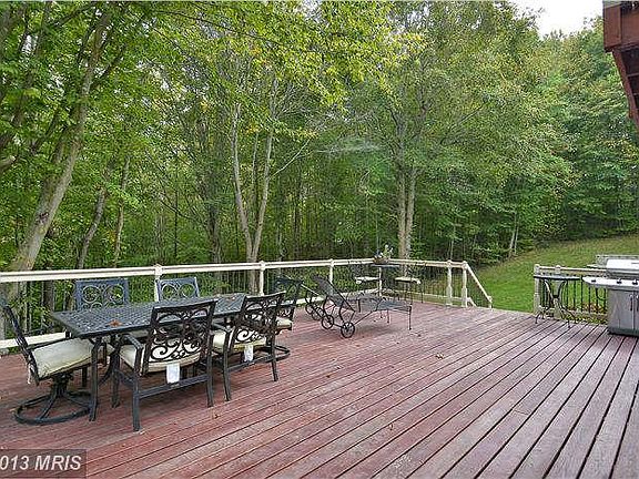 Bear Creek home nestled on 5.56ac! So many wonderful features & improvements - HW floors, stone FP, updated granite, marble & stainless kitchen, office w/glass doors & bookcases, all baths updated, newer tiered decks, balcony off MBR. Great BR sizes. Finished LL boasts RecRm, poss BR, bath, & theatre room w/144" 1080 HD screen (components & seating convey)! Tranquility only nature can provide.