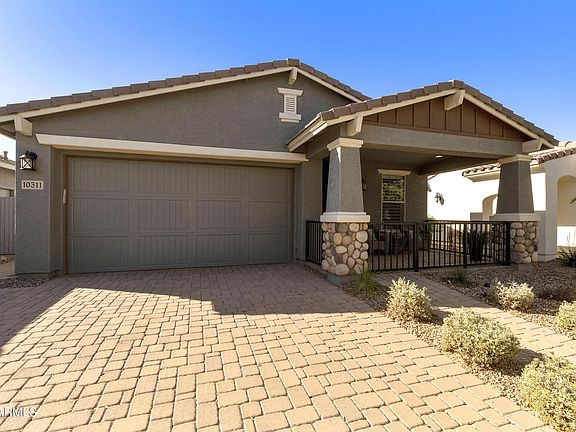 A must see! The Charleston is a split plan with 2 bdrms, 2 bths, den, & great rm. The kitchen has SS appliances including a gas stove with dble oven, quartz counters, white soft close cabinets, & farm sink. The owners suite has a W-I closet, W-I shower, raised vanity with dble sinks. Home is appointed with wood plank tile, shutters, two tone paint & 8' doors. The extended covered patio with travertine overlay leads to the sparkling pool with water feature, pop up system, & pebble tech finish. You'll love the easy maintenance landscape & the above ground spa. The garage is extended with an epoxy floor & overhead storage. Come enjoy Encore, an award winning 55+ community with pickle ball, tennis, bocci ball, clubhouse, W/O facility, billiards, pool/spa & much much more!