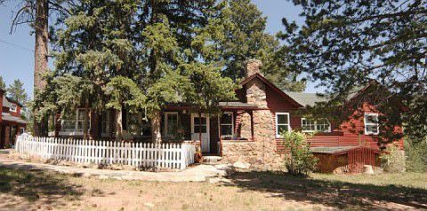 Vintage charmer sitting in a 3+ acre private park. Truly unique opportunity to own and update one of the few vintage homes in the Conifer area. White picket fence and rock walkway lead to the covered front porch. 3 bedroom log sided home with a large vaulted and beamed living room, dining room with leaded/stained glass inset and antique stove, original hardwoods throughout all/most, claw foot tub of course. Plus a separate studio apartment and loads of storage - over 600 more finished sq ft. The lot is remarkable - compete with rock outcroppings, perfect picnic spot, original grass tennis court with gazebo, very private with wonderful rock outcroppings and mtn views. Do the updates and enjoy the rewards!