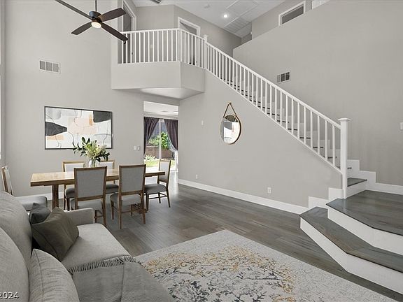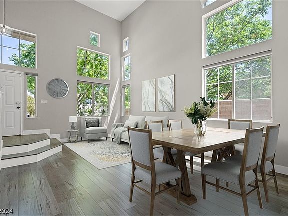 This Sophisticated Summerlin Stunner awaits!!! Impressively large 2-story entryway that leads to that Open, Airy feeling as you dance throughout the home. Elegantly designed Kitchen with upgraded stackable floor to ceiling cabinets, backsplash and Kitchen Sink overlooking a charming window!! Opposite of the dining area is a beautifully built-in buffet showcasing matching finishes throughout the home giving the space a designer touch! Head upstairs to find 4 beautifully sized bedrooms, one featuring a CUSTOM built-in closet. Primary bedroom exudes luxury with vaulted ceiling, DUAL closets and the most luxurious of bathrooms with custom shower/tile/glass and equally eloquent dual vanities! Oversized backyard that’s most definitely a “pool sized lot” should you choose to install one at a later date. Until then, enjoy all the space this one has to offer with grass and mature landscaping. The opportunities are endless! Refrigerator, washer/dryer and soft water system convey with home.