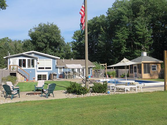 Just what you have been waiting for - a home where you can have loads of family fun! The seller has thought of everything - this home has it all! Four bedrooms including a master suite, 3 baths, all situated on 3.5 acres. Home features a lovely three season room overlooking a fabulous fenced back yard with an in-ground pool, outside cabana, fire-pit and volley ball grass court and garden spot. Heated and air-conditioned 20 X 52 pole barn with a wood working shop, office, an attached 10 x 20 s torage shed, with an additional 2-story storage barn with play house. Large kitchen with ample cupboards, walk-in pantry and family size dining area. Beautifully landscaped yard, paved drive, underground sprinkling. Heating system is a cost effective heat pump and natural gas. This home is super sharp and absolutely turn-key! See this one today and be ready for the summertime family fun!