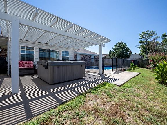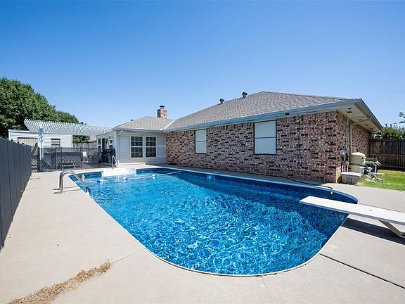 Nestled within the highly sought-after Greenbriar Kingspark community in South OKC, this residence offers an exceptional living experience. A backyard haven awaits, complete with a generously sized POOL featuring a diving board, a covered patio adorned with a pergola housing a newer HOT TUB, and a convenient storage shed. The HOA further enriches your lifestyle with access to a swimming pool, a clubhouse, tennis courts, and direct walking trails leading to the nearby elementary school. As you step inside, an inviting and updated kitchen welcomes you, boasting granite countertops and an expansive kitchen dining area. The living room is thoughtfully designed with abundant built-ins, complemented by beamed ceilings and a brick gas-burning fireplace, providing ample space for gatherings and entertainment. Adjoining the living room is a captivating sunroom that opens up to a pergola-covered patio, offering stunning views of the pool. All the bedrooms are conveniently situated on one side of the home. These substantial bedrooms, currently furnished with king beds, offer ample space and plentiful closet storage. The secondary bathroom features a walk-in jetted tub for your comfort. The master bedroom boasts a tastefully designed accent wall, a spacious stand-up shower, a walk-in closet, and additional space for relaxation. Ideally located in the desirable Southmoore school district, this home truly embodies the essence of comfortable living. Welcome to your new home!