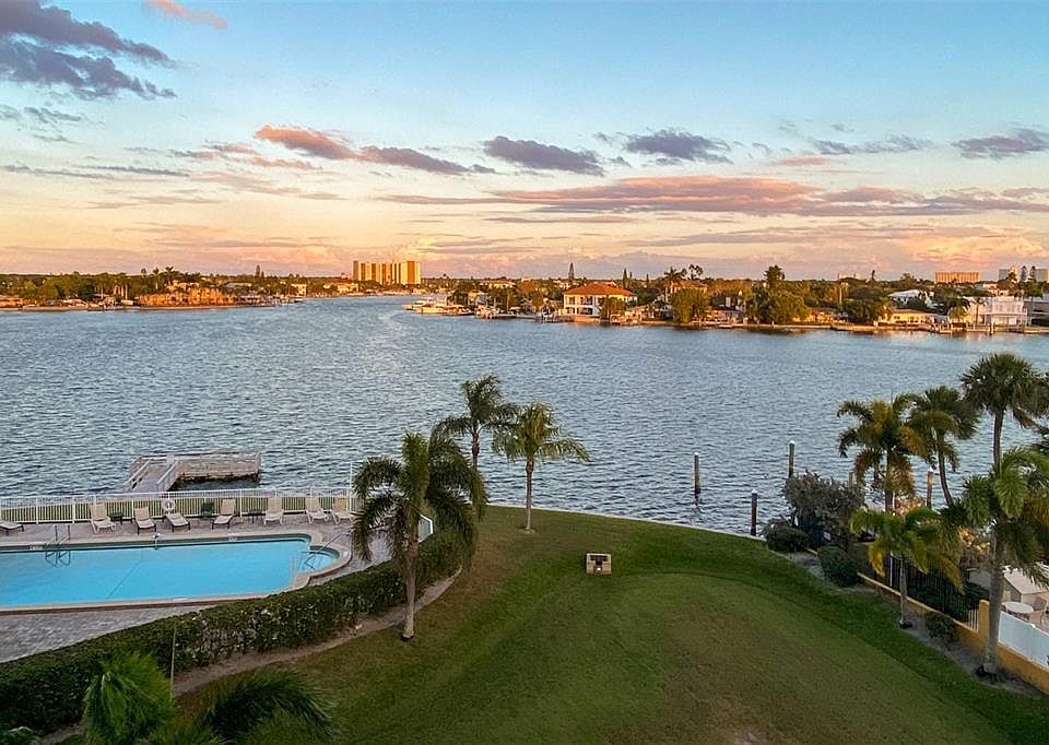 AMAZING WATERFRONT CORNER UNIT. "PRIME VACATION DESINATION." BEST VALUE CONDO/HOTEL ON TREASURE ISLAND.LOCATED ON THE OPEN INTRACOASTAL AND ACROSS FROM THE GULF OF MEXICO. BEACH ACCESS RIGHT ACROSS THE ROAD. KEEP THE INCOME FLOWING. YEAR-TO-DATE INCOME PLUS VACATION BOOKINGS $32,352.00. A pleasing wide open Intracoastal water view from your 3rd FLOOR CORNER UNIT. PALMS OF TREASURE ISLAND BUILT IN 2007/ NICELY and NEWLY UPDATED 2 bedroom / 2 full baths. Newer Luxury vinyl flooring, New A/C system 2022, New Hot water heater 2023, FULL FUNCTION KITCHEN WITH GRANIT COUNTERS, in-unit washer and dryer, tastefully furnished. Huge Balcony 8.7' X 24'. Plenty of natural light throughout the open floorplan. Finest CONDO/HOTEL on the Island with a steady flow of Income. THIS IS a wonderful Turnkey waterfront luxury unit on the wide open Intra-coastal. Beautifully landscaped surroundings, WATERFRONT thermo-heated pool & spa. Under building parking & plentiful guest parking. Located across the road to the GULF OF MEXICO. "Add this one to your 401K." Monthly condo fee of $824. includes Cable TV, Escrow Reserve Fund, Insurance, Internet, Maintenance Grounds, Water, trash removal. A True Value. NOTE: Limited Access due to high volume vacationer bookings. Showings between guest check-out and check-in. Close proximity to shopping, restaurants and the BEST BEACH IN ALL OF FLORIDA. Penty of covered and open parking. PALMS OF TREASURE ISLAND BUILD IN 2007