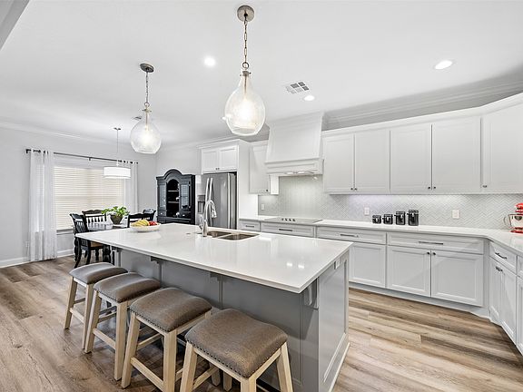 Step inside to a bright, open-concept floor plan featuring LVP flooring, crown molding, and a spacious living area with a wood-burning fireplace surrounded by custom built-ins. The kitchen offers a large bar, abundant cabinetry, and convenient drawer storage, all opening to a cozy breakfast area and inviting living space—perfect for family gatherings and entertaining.