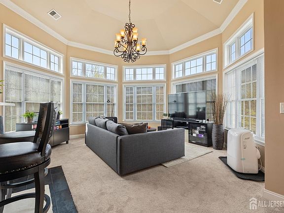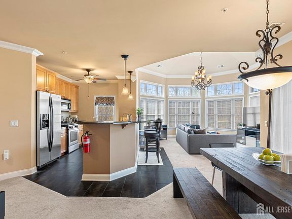 Rare opportunity to own the sought-after Harrington model in The Plaza Grande, a premier 55+ community. This spacious third-floor unit boasts an open layout with a dramatic octagon-shaped living room, soaring domed ceiling, and floor-to-ceiling windows that flood the space with light. The gourmet kitchen features 42'' custom cabinetry, granite countertops, stainless steel appliances, and wide-plank wood flooring, flowing seamlessly into the elegant dining areaperfect for entertaining or quiet nights in. The primary suite offers a tranquil retreat with bay windows, crown molding, two walk-in closets, and a luxurious bath with soaking tub, frameless shower, and double sink vanity. A generous guest bedroom and full bath provide comfort for visitors, while a versatile den/library can serve as a third bedroom. Enjoy direct garage entry, elevator access, clubhouse, pool, tennis, gym, and more. Minutes from shopping, dining, and NYC transitthis stunning home is a must-see!