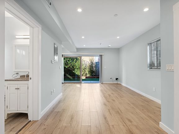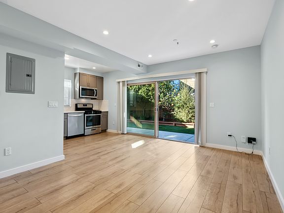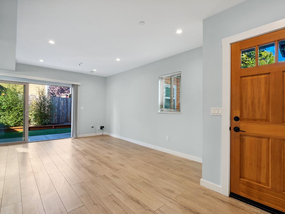 Spacious and stylish 4+BR 3 BA 2-story townhome for rent on the Emeryville/Oakland border. Super clean and looking like new, this bright and airy home welcomes you with a well-designed ground floor that features an inviting entry, dining and living areas, a full bath and 1 bedroom, and a chef's kitchen with stainless steel appliances including a dishwasher. Huge patio doors lead to a backyard with turf and patio areas, and a converted garage that can be used as a bonus/bedroom/storage/office area. There is also a separate outdoor shed for storage. Upstairs there is a large primary bedroom with a walk-in closet, en-suite bathroom, plus a big, private, sunny balcony. There are two other bedrooms on this level, plus a full bathroom in the hall along with a washer/dryer. The entire unit is super-clean and features wood and tile floors throughout. The gated driveway has space for two cars. The location is close to transportation, bus, MacArthur BART, freeway entrances, Emeryville shopping center, and tons of restaurants No smoking. Small pets ok. Tenant responsible for Electricity and Gas. Landlord to pay for water and trash included in rent.