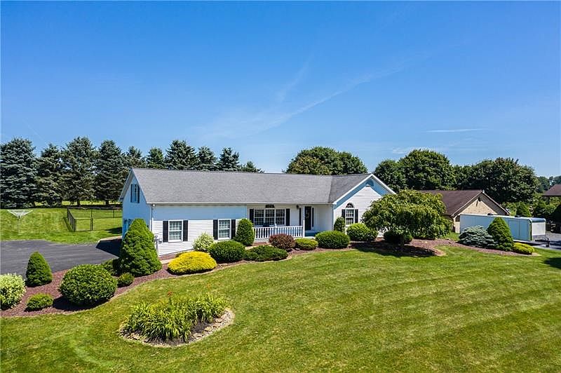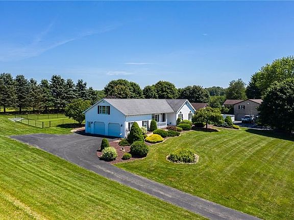 An absolutely stunning custom built ranch situated on 1.12 acres in Oakland Twp, Butler Pa. Professionally landscaped, meticulously maintained, and very spacious! The 3rd bedroom loft is currently being utilized as a family room; a fantastic versatile space w/ a custom window seat and built in shelving. Living room features a cathedral ceiling, skylights, & beautiful wood beams that bring natural light & character to the space. Beautiful oak cabinetry, S.S. appliances, & ceramic tile flooring in the kitchen along with an open layout to the dining area. 1st floor laundry/mud room, finished basement w/ game room, workshop/exercise space, & full bath. Useful over-sized garage w/ man door to the outside. Relax & entertain w/ the back deck, gazebo, and fire pit. Covered front porch, 52x36 back yard fence, shed, radon system, water softener system, and newer underground electrical line. Amazing well-built home on a beautiful piece of property; a must see! 1-Year Home Warranty included!