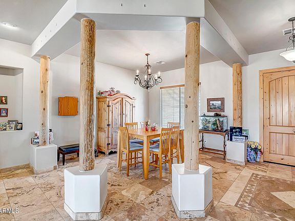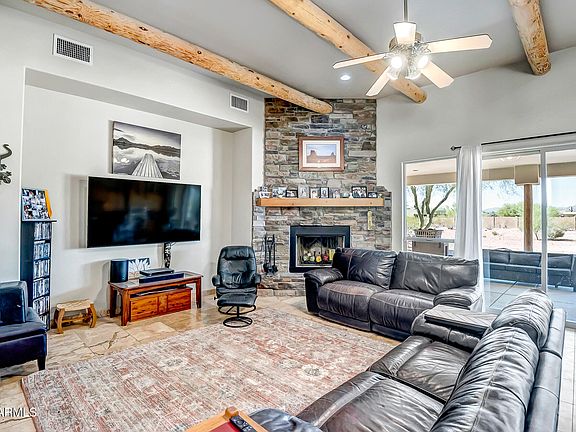 Beautiful custom home with high end finishes on over an acre with no HOA. Great room is light and bright, with 12' ceilings, exposed wood beams, stone front fireplace, open to the kitchen and dining room. Kitchen has a perfect layout with a huge island, granite countertops, and staggered cabinets with crown molding. Primary bedroom is split from other bedrooms, has a large walk-in closet. Other great features: high ceilings throughout home, travertine floors and newer carpet, city water (no shared well), fully fenced in backyard with beautiful mountain views, 15'x5' Artesian Swim Spa, large covered patios front and back,1000sqft attached garage with epoxy flooring, two bedrooms have jack and jill bath each with their own private vanity space, large laundry room with cabinetry. A must see!