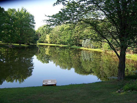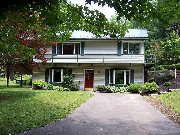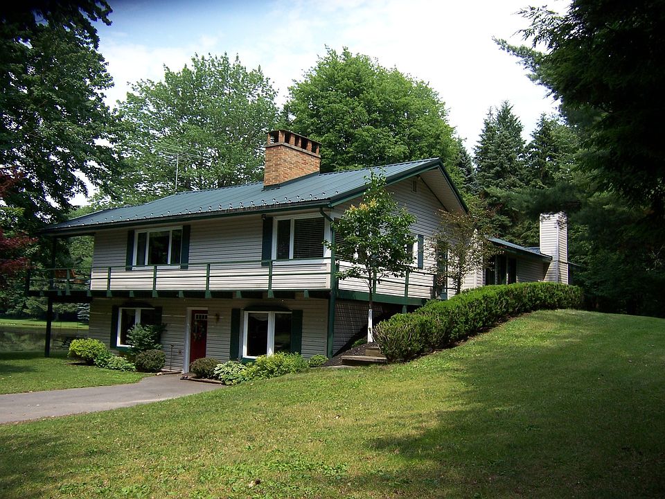 A nature lover's paradise. A winding blacktop drive leads to a private home built into the hillside. The main level lives like a ranch and enjoys second story expansive views of the grounds, woods, lawns and a pond. Vaulted ceiling liv rm with all stone WBFP and a wall of doors leading to a 21 x 10 covered deck overlooking the pond. Generous sized dining room, bar room with adjacent sauna and covered in-floor hot tub (not in use). Expansive fam rm w/vaulted ceilings, pellet stove sliding doors.Stunning views from the lovely master w/ gorgeous master bath and walk in closet. Nice eat in kitchen with bright corner window. 2 bedrooms in the walk-out lower level each have extra large windows overlooking the pond. Detached 2 car garage, plus shed and 2nd garage. Wonderful paths and woods.