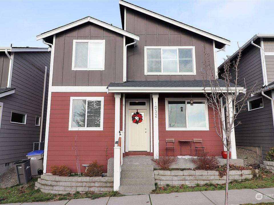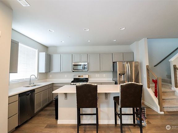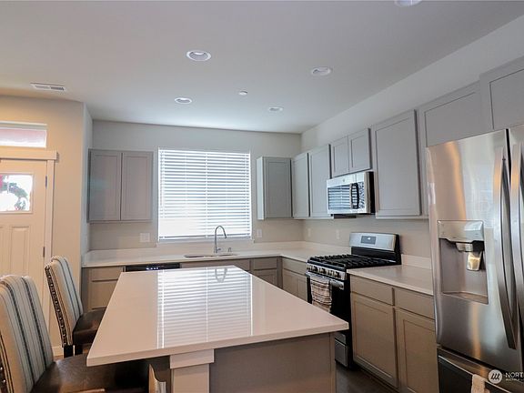Water views in this 3 bedroom, 2.5 bath newer construction home. The main floor features an open concept kitchen with a large island and quartz countertop. Laminate flooring on main floor, which also includes the dining room, living space and half bath. Upstairs is the primary bedroom suite with quartz counters, two walk-in closets and french door door entry. Also upstairs is the laundry room and two more bedrooms with views of the Puget Sound. Upgraded mill work package and soft close cabinets throughout the home. Walking areas throughout the community and walking distance to the YMCA, Ice skating rink, and swimming pool. Just minutes from schools. Easy access to bus line, close to shopping, ferries, and all bases. Don't miss this one!