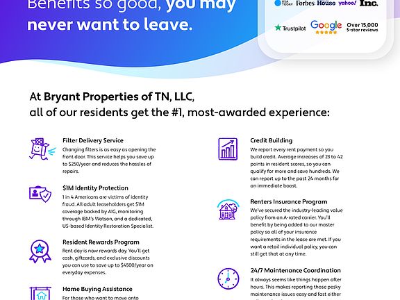 Great Floor Plan, All Bedrooms on Main Floor, Master Bedroom Suite, Large Walk-In Closet, Eat-in Kitchen, Open Dining and Living Room with Fireplace with Gas Logs, Central Heat & Air, Large Bonus Room over 2-Car Garage, Nice Level Lot on Dead End Street Concrete Driveway. Auto-enrollment in the Resident Benefits Package (RBP) is $40/mo. included in the rent along with renter's insurance, flyer in media section. This Property has a Rently Lockbox on Front Door for Self Showings. STATUS: Vacant AVAILABLE DATE: 04/01/2025 RENT: $2,800 DEPOSIT: $2,800 TYPE: Single Family YEAR BUILT: 2010 BEDROOMS: 3 BATHROOMS: 3 SQ FT: 2064 based on tax records GARAGE: 2-Car Attached UTILITIES INCLUDED: None HOA FEE: No PET RULE: No Pets SMOKING: No Smoking in Property MIN. LEASE: 12 Months RENTERS INSURANCE: Required Before Move In APPLICATION TURNAROUND TIME: 24 to 72 Business Hours If you decide to apply for one of our properties, there is a $50 per adult application fee that is non-refundable. Anyone aged 18 or above who will be residing at the property must apply. We will (1) check your credit report; (2) check for any past evictions; (3) verify your employment, if applicable; (4) personal income must be sufficient and verifiable; (5) verify your previous landlord references; and (6) perform a criminal background screening; (7) be aware that some HOA also have application fees. We encourage you not to apply if you have credit scores below 500, have ever been evicted, have bad rental history or have recent or drug/violence related felonies, or if you are in a bankruptcy. Bankruptcy has to be discharged. If you are approved you will need renters insurance before move in with $100,000 liability and Bryant Properties of TN, LLC listed as additional insured.