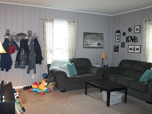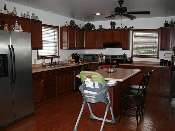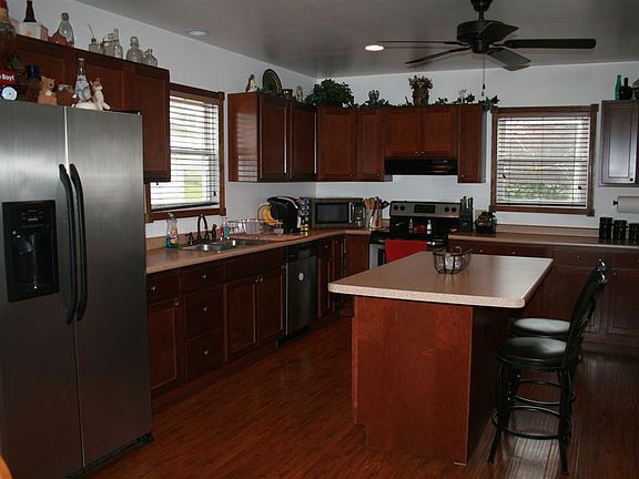 • AMENITIES: Ceiling Fan(s), Detector-Smoke, Porch Covered, Main Floor Laundry, Cable Ready, Deck Open, Eat-In Kitchen, Closet(s) Walk-in, Dryer Hook Up Electric, Ceiling-9+, Tub/Shower Combination, Kitchen Island, Countertops-Laminate, Firepit, Custom Cabinetry, Near Walking Trail