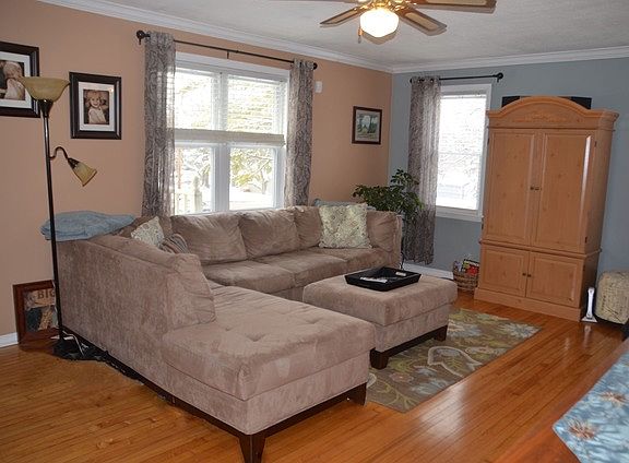 So much charm walking distance to town & elementary school! Well maintained home has many features--HW flrs, crown moulding,kit w/ SS appliances, sun room off kitchen, updated bath w/granite & whirlpool tub, finished basement w/ family room and lots of storage! Enjoy the brick patio overlooking the HUGE backyard. Extra deep 2 car garage and storage shed. Vinyl siding for modern look, easy care added 2019. Attractive landscaping front and back. Separate brick circle for safe backyard fires! Your outdoor wonderland! Ready for you to move right in!